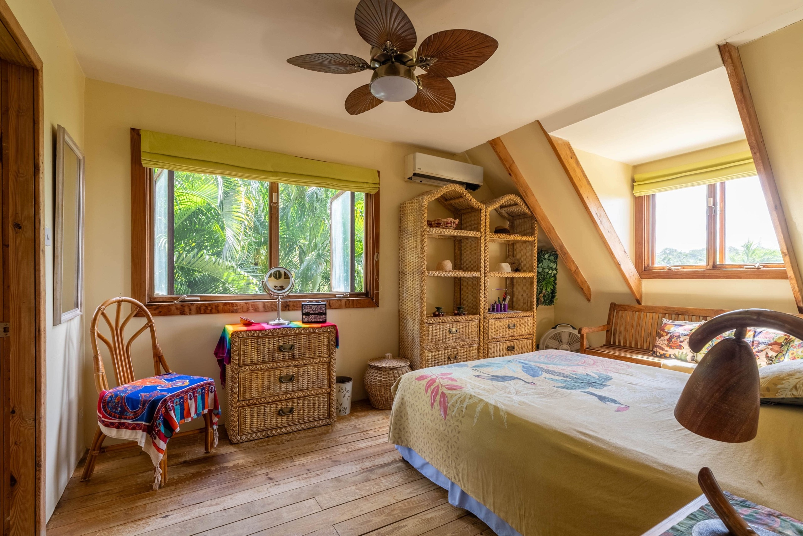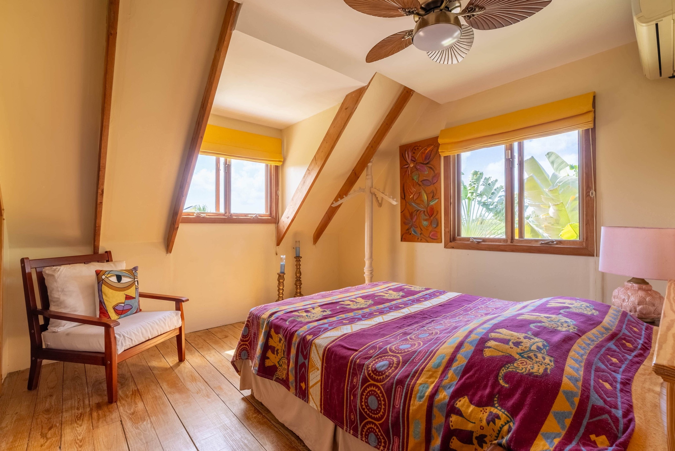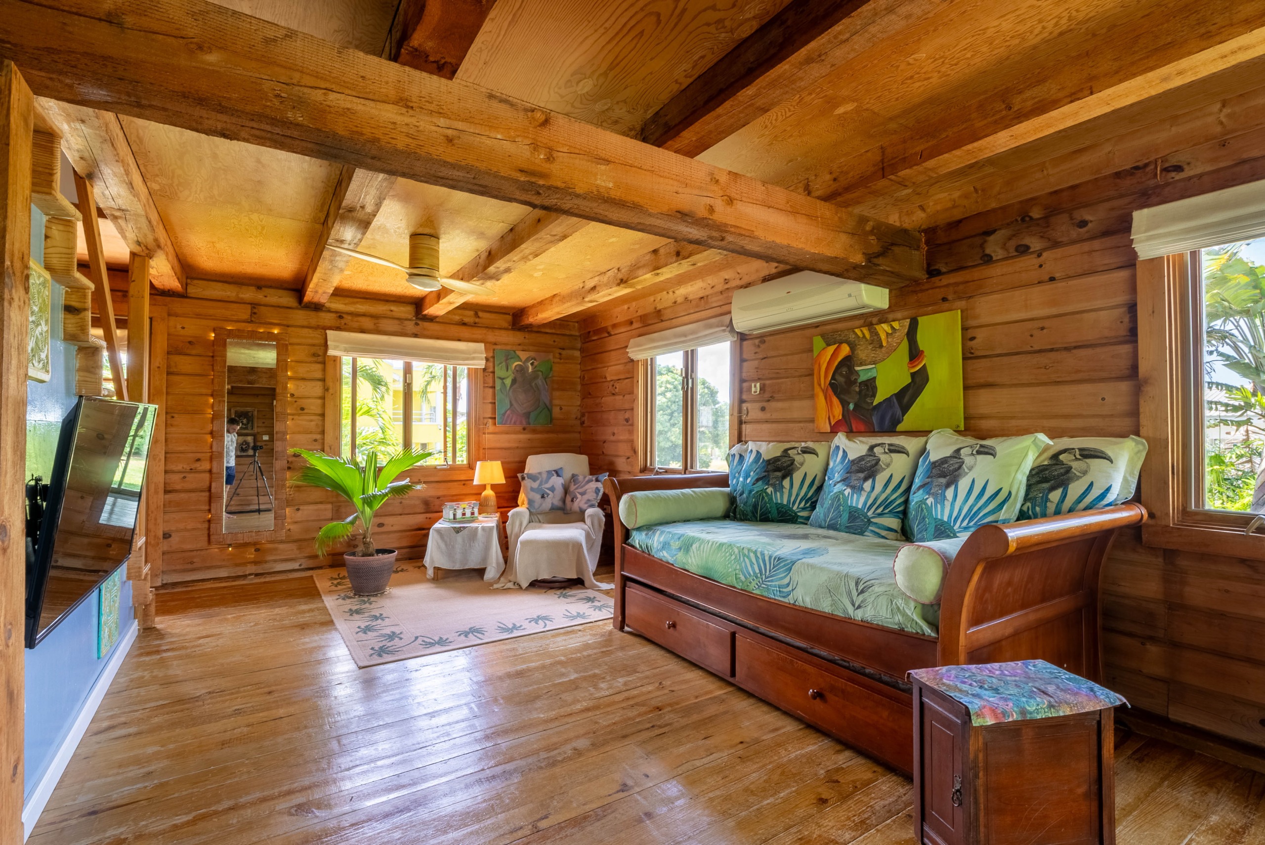 Features wooden floors and storm-resistant gable roofing.