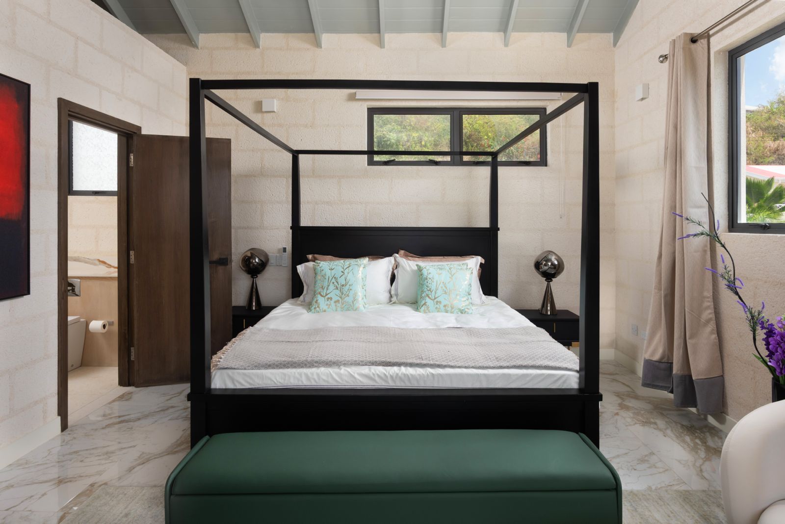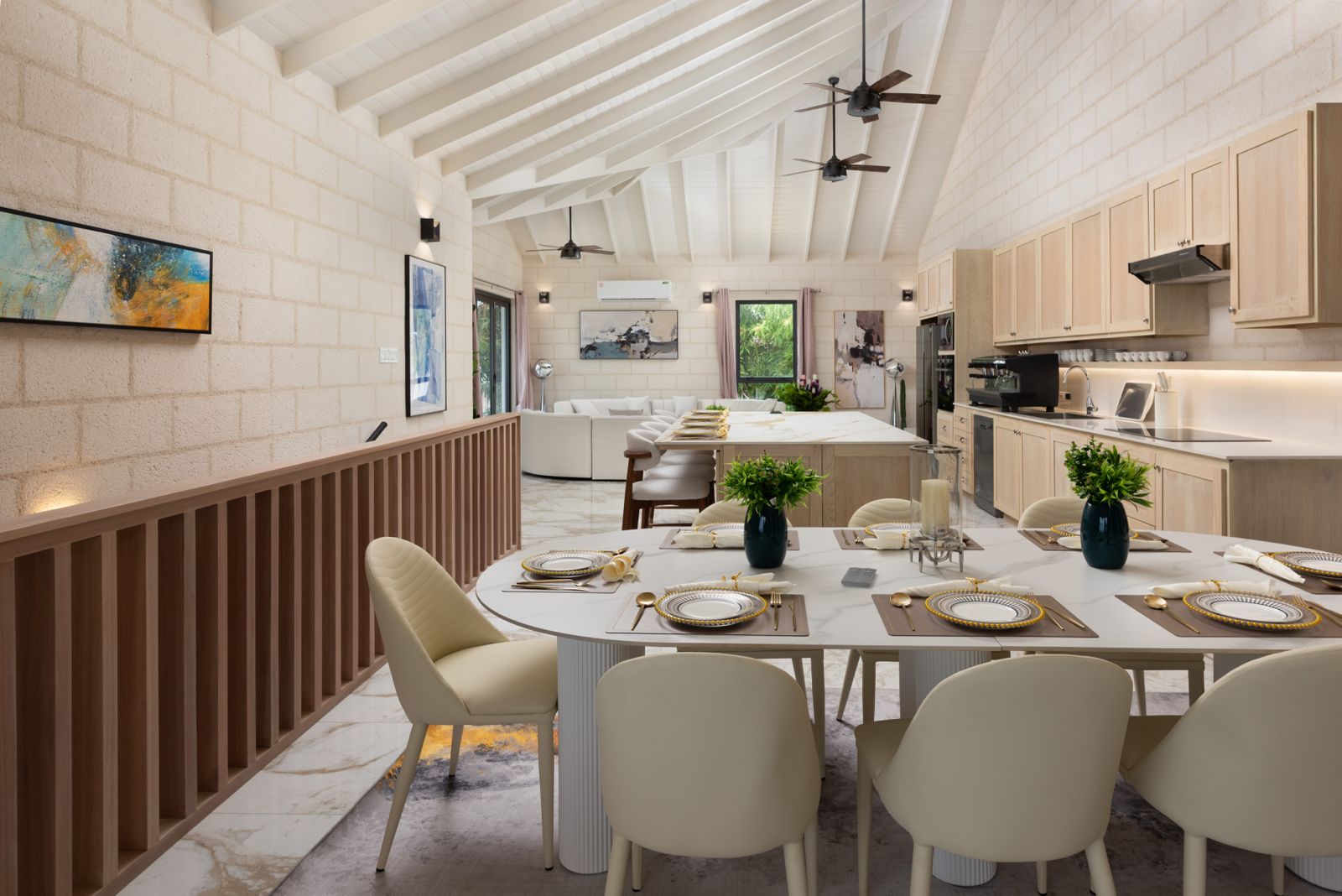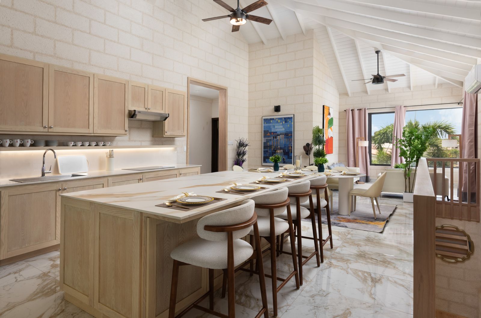 The upper floor features four bedrooms and three bathrooms (two en-suite), high ceilings, a day room, living room, and a custom kitchen with coral stone accents, white mahogany cabinetry, and a large island with porcelain countertops. A cozy reading nook and several living areas enjoy views of the Caribbean Sea, including the primary suite which opens out to a private balcony.
