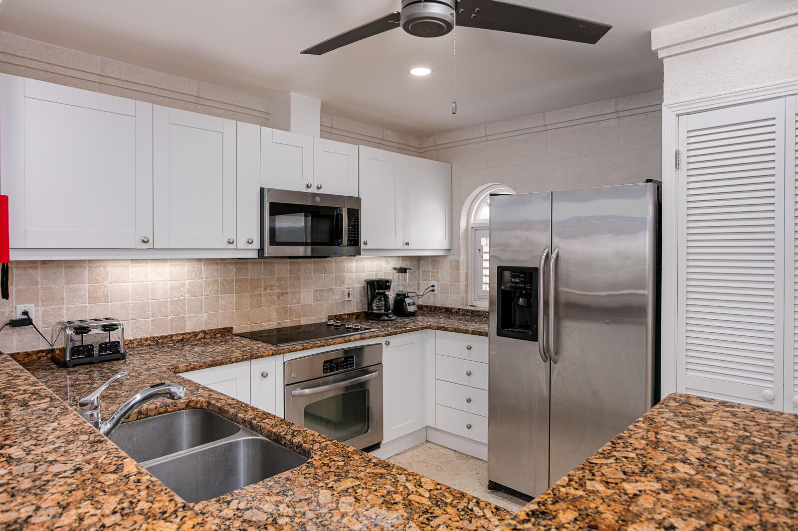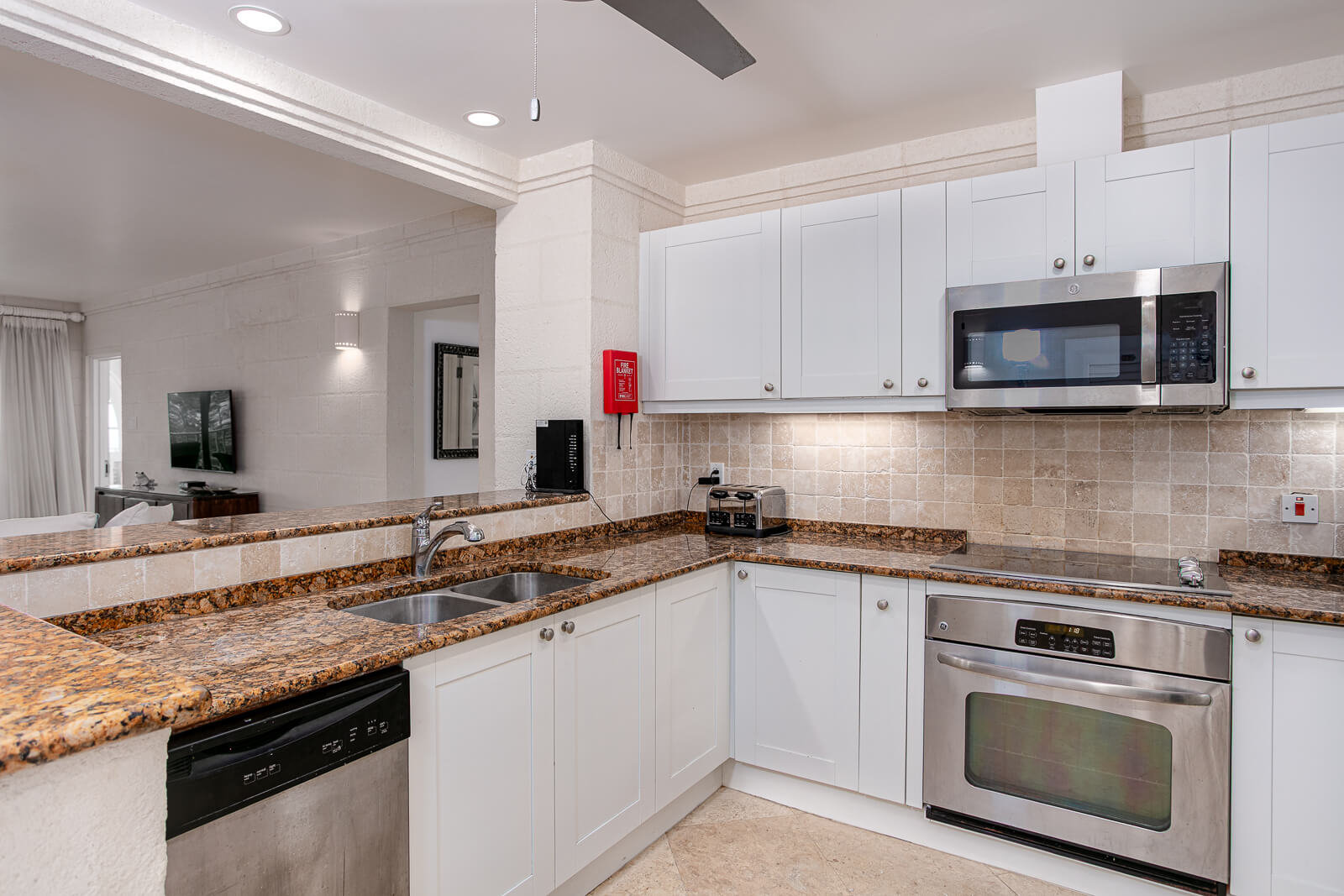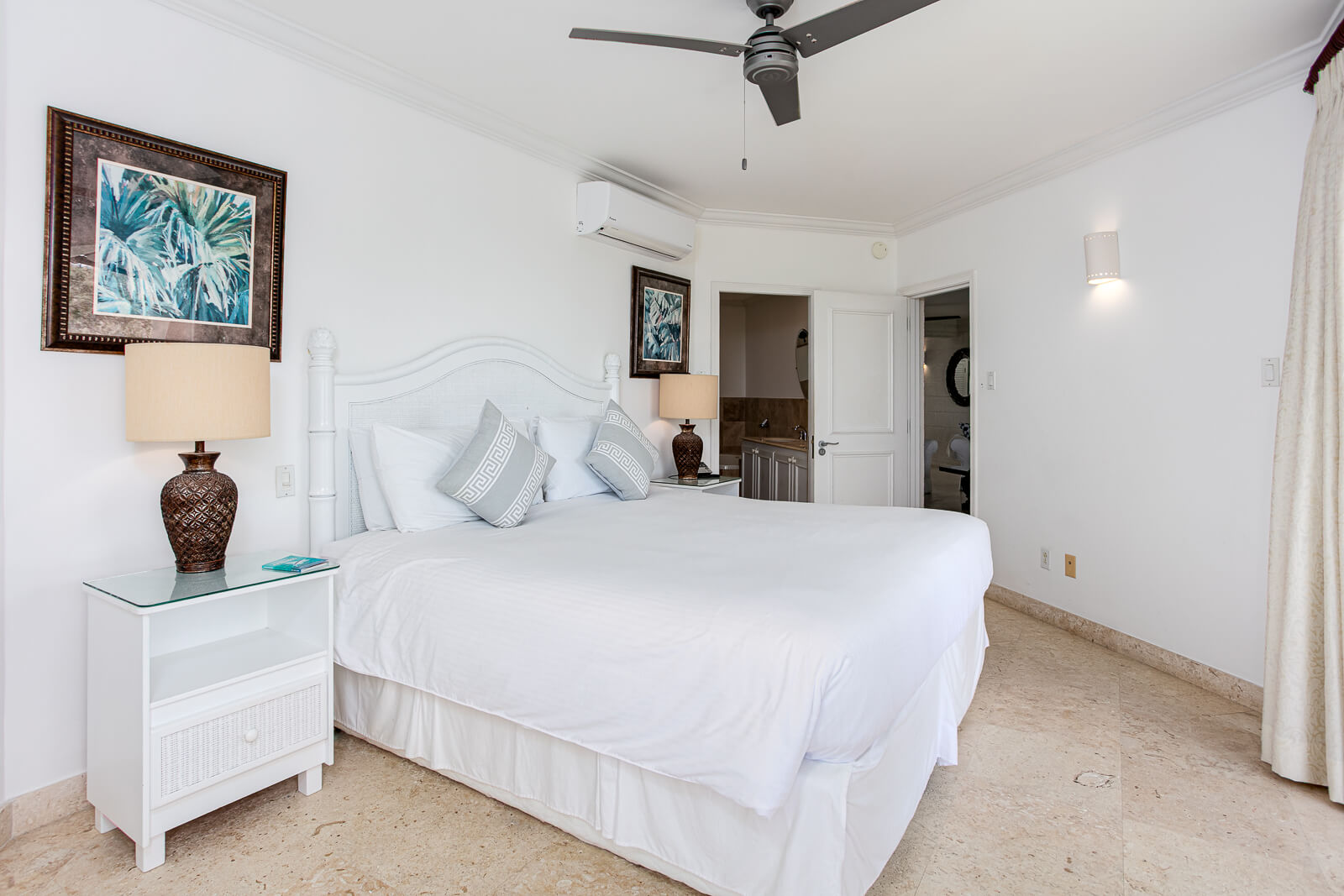 Step inside and you’ll find an open-concept kitchen, dining, and living area that flows effortlessly onto a covered terrace—your private spot for sunset cocktails, lazy breakfasts, or quiet evenings under the stars. The kitchen comes fully equipped with quality appliances and a breakfast bar, perfect for entertaining or everyday ease.The primary suite is an elegant retreat featuring a kingbed, walk-in closet, and a spacious en suite bathroom with a double vanity, jacuzzi tub, and separate shower. This suite also opens onto the patio, allowing you to wake up to ocean views every morning. The second bedroom offers a queen-sized bed, ample storage, and access to a full bathroom just steps away.